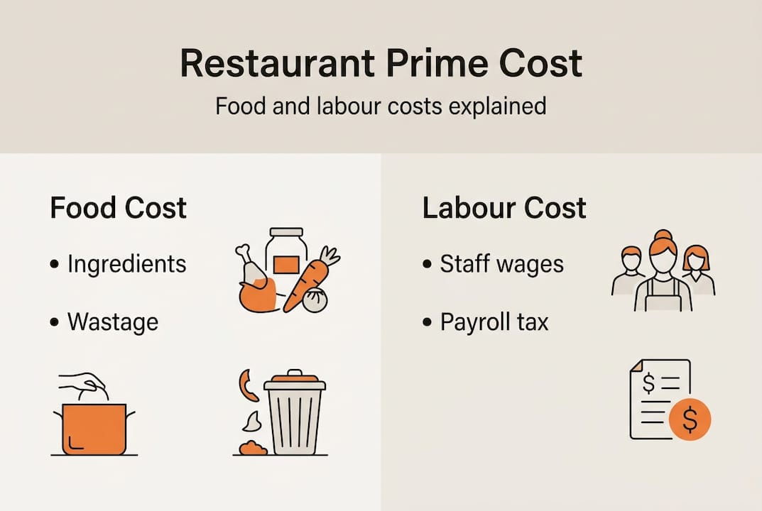 Prime cost is the combined total of food and labour costs as a percentage of revenue. For UK independents, the recommended target is 55 to 65%.