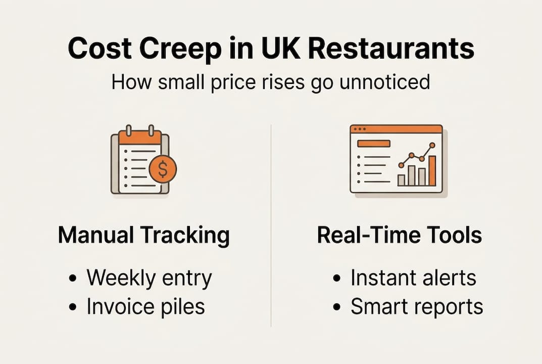 This is what cost creep looks like in practice. A supplier quietly raises the price of a key ingredient by 5%. You do not notice because the invoice looks similar to last month. You carry on ordering the same quantities, charging the same menu prices, and wondering why your margins feel slightly tighter than usual. According to industry data, manual delays cause 3 to 5% unnoticed cost increases across food businesses operating without real-time visibility.